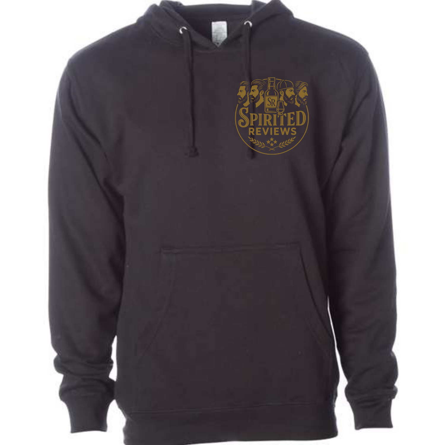Black Independent SS4500 midweight hoodie with the main Spirited Reviews logo printed on the front left chest in gold.
