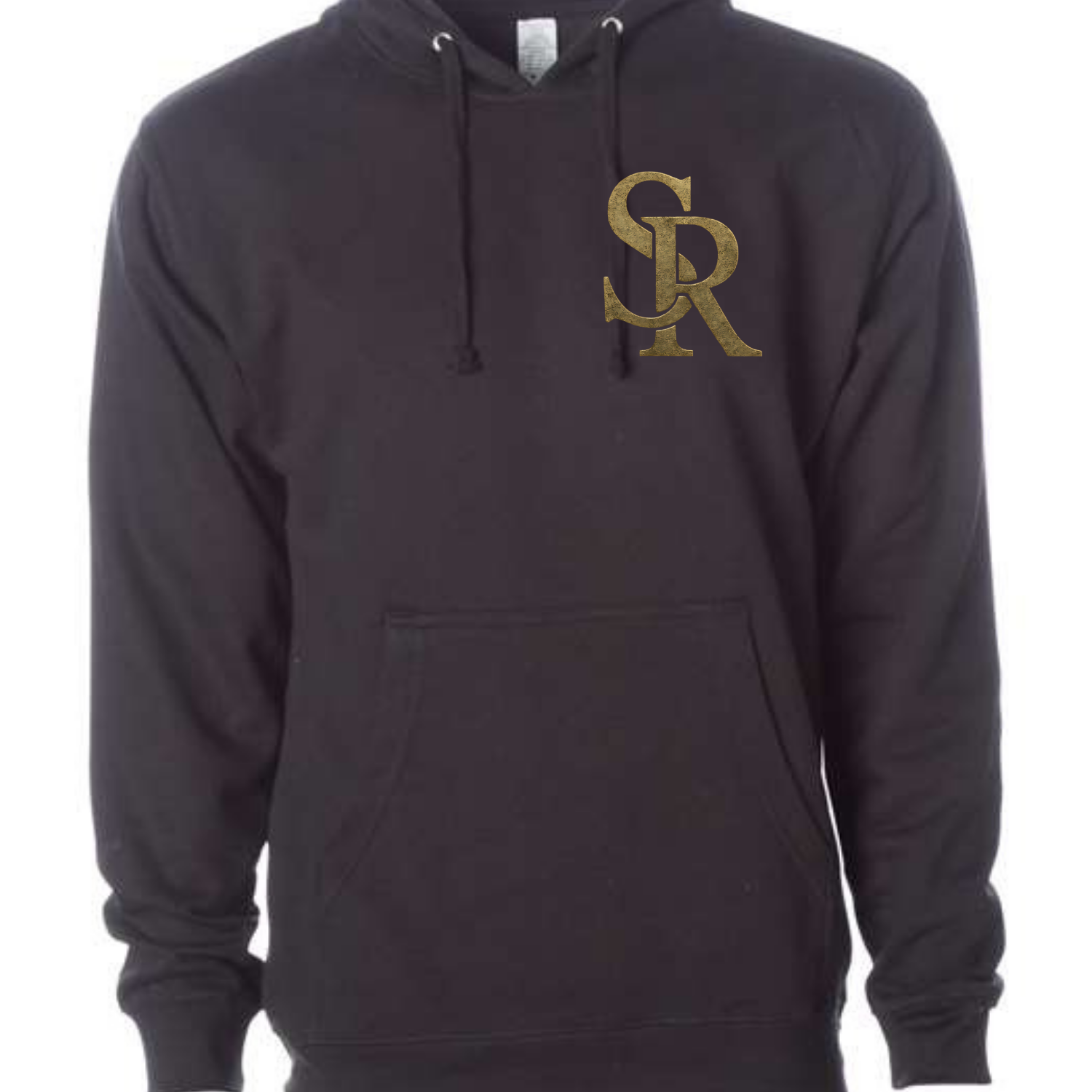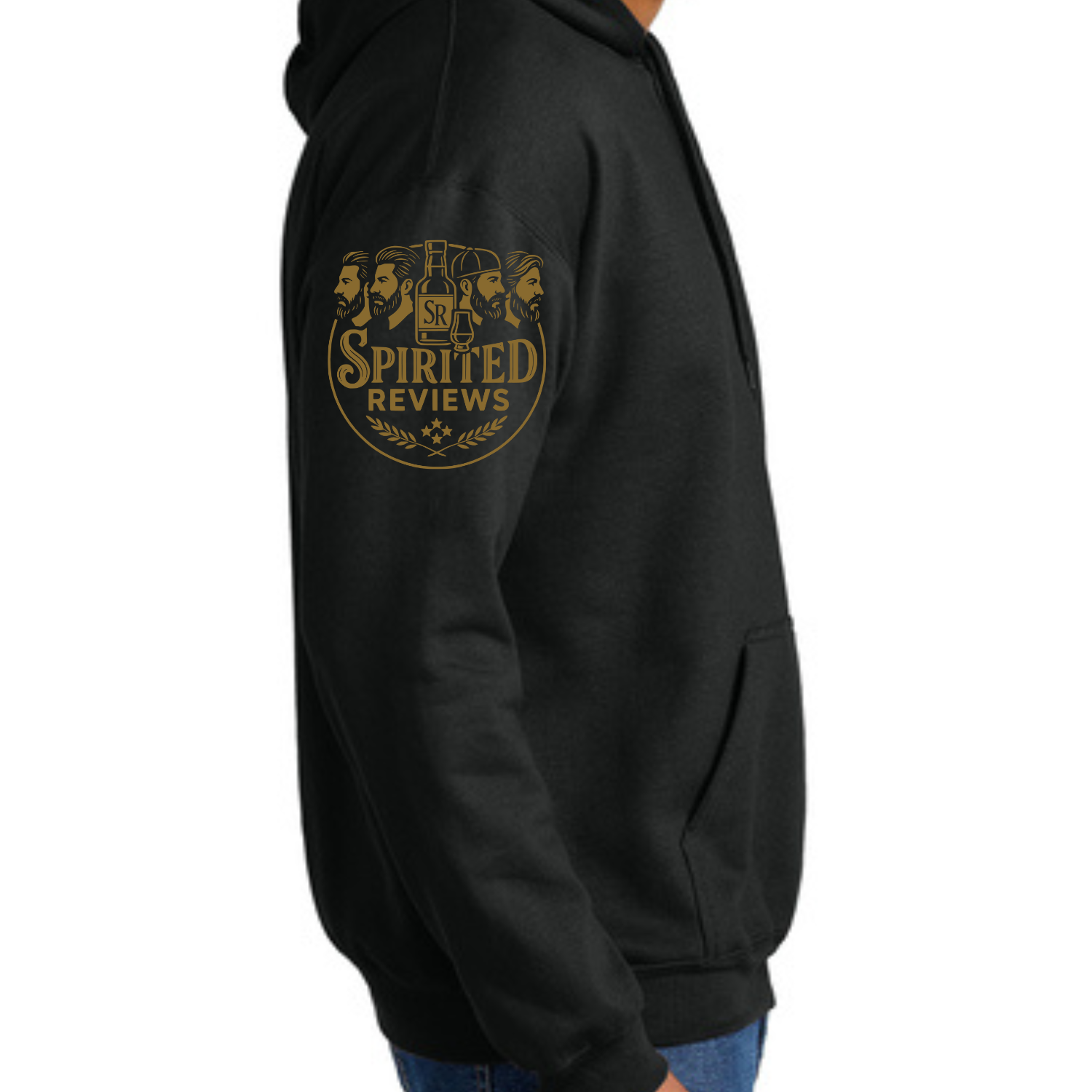 Black Independent SS4500 midweight hoodie with the SR logo printed on the front left chest and the main Spirited Reviews logo printed on the right shoulder in gold.