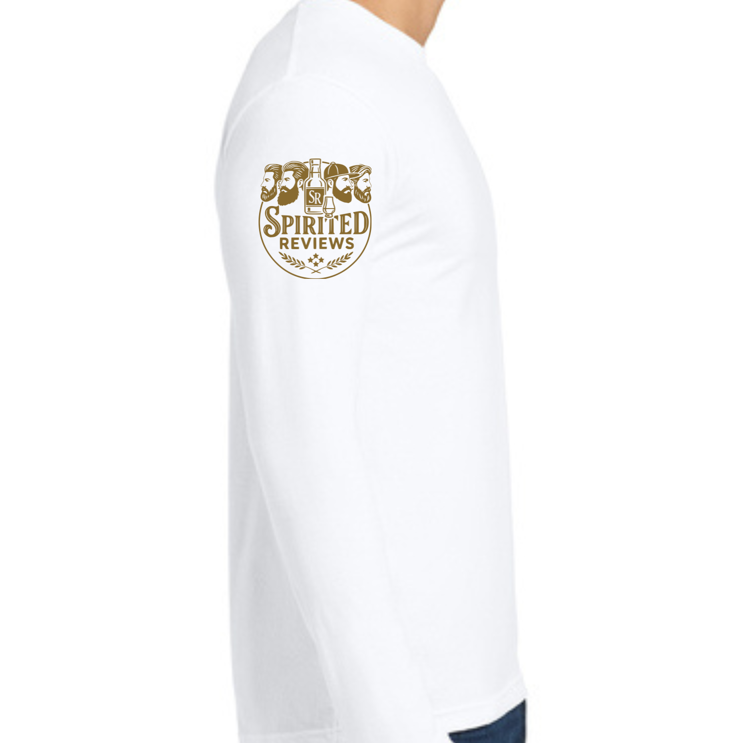 White Gildan Soft style long sleeve t-shirt with the SR logo printed on the front left chest and the main Spirited Reviews logo printed on the right shoulder in gold.