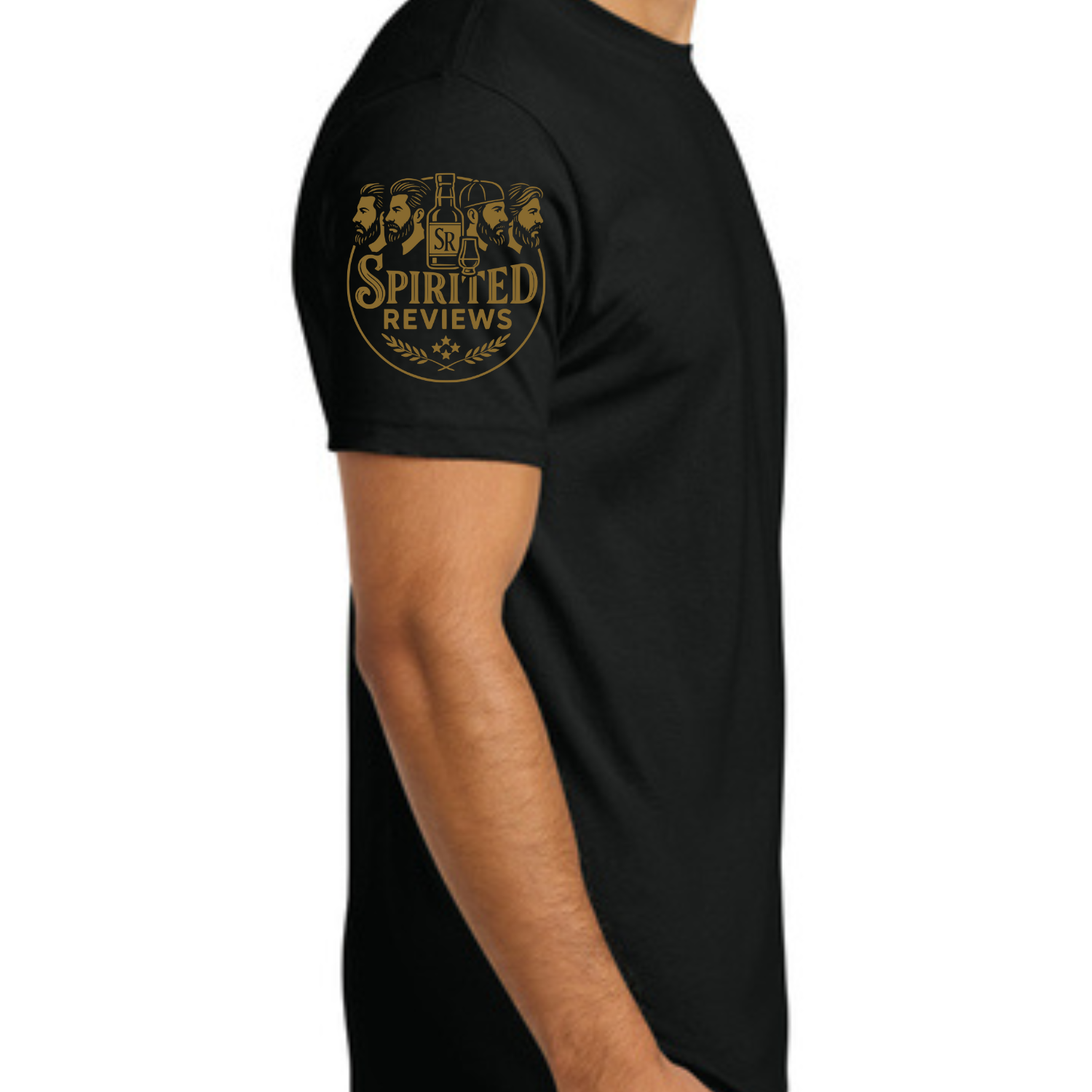 Black Next Level 3600 short sleeve t-shirt with the SR logo printed on the front left chest and the main Spirited Reviews logo printed on the right shoulder in gold.