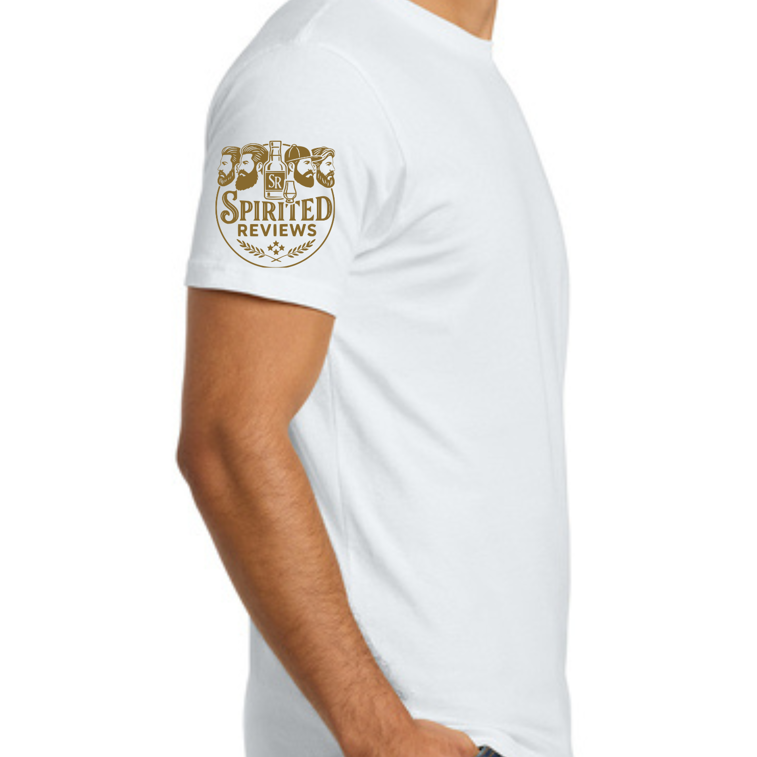 White Next Level 3600 short sleeve t-shirt with the SR logo printed on the front left chest and the main Spirited Reviews logo printed on the right shoulder in gold.