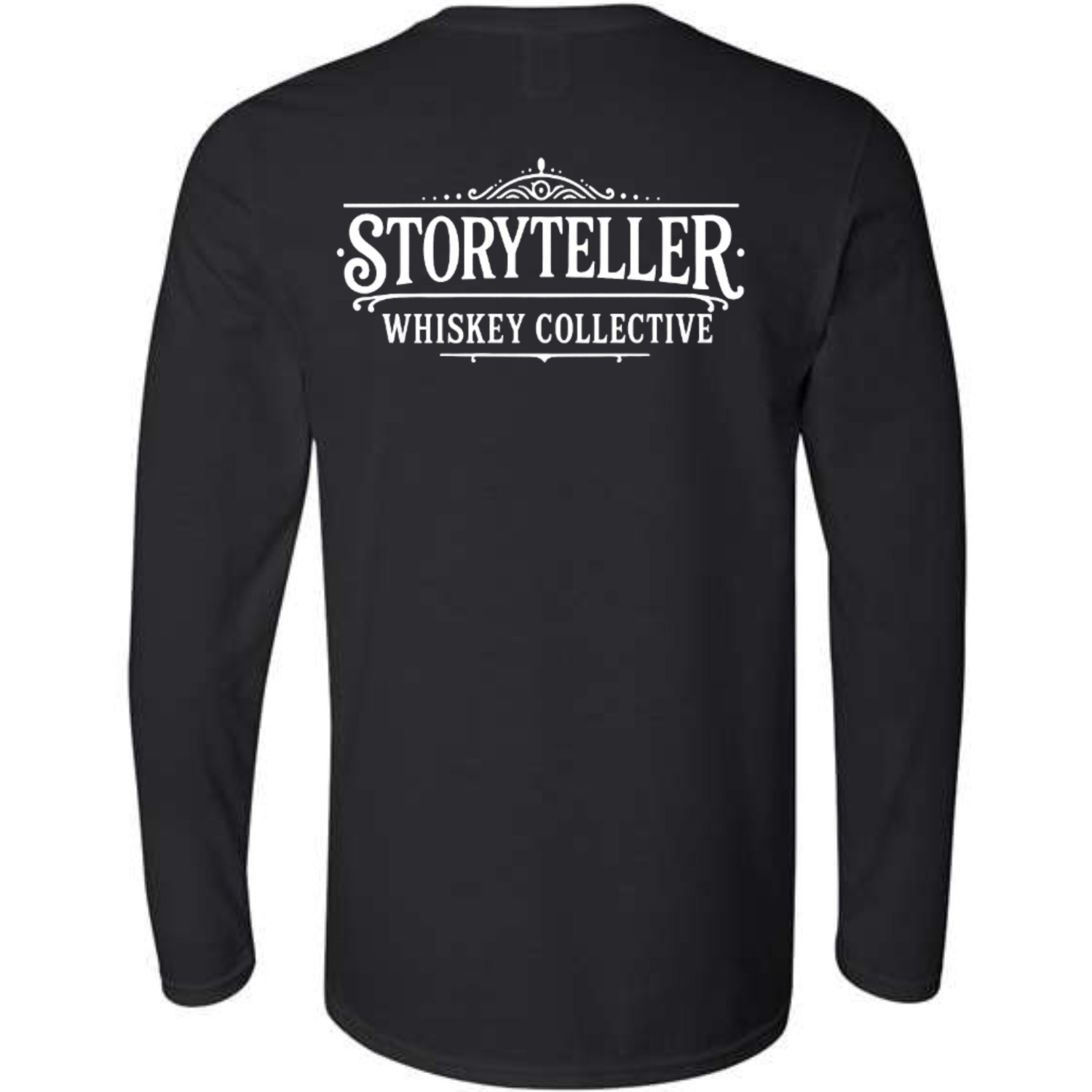 Black Gildan SoftStyle Crewneck Sweatshirt with the Storyteller Whiskey Collective text logo printed on the left front chest and back.