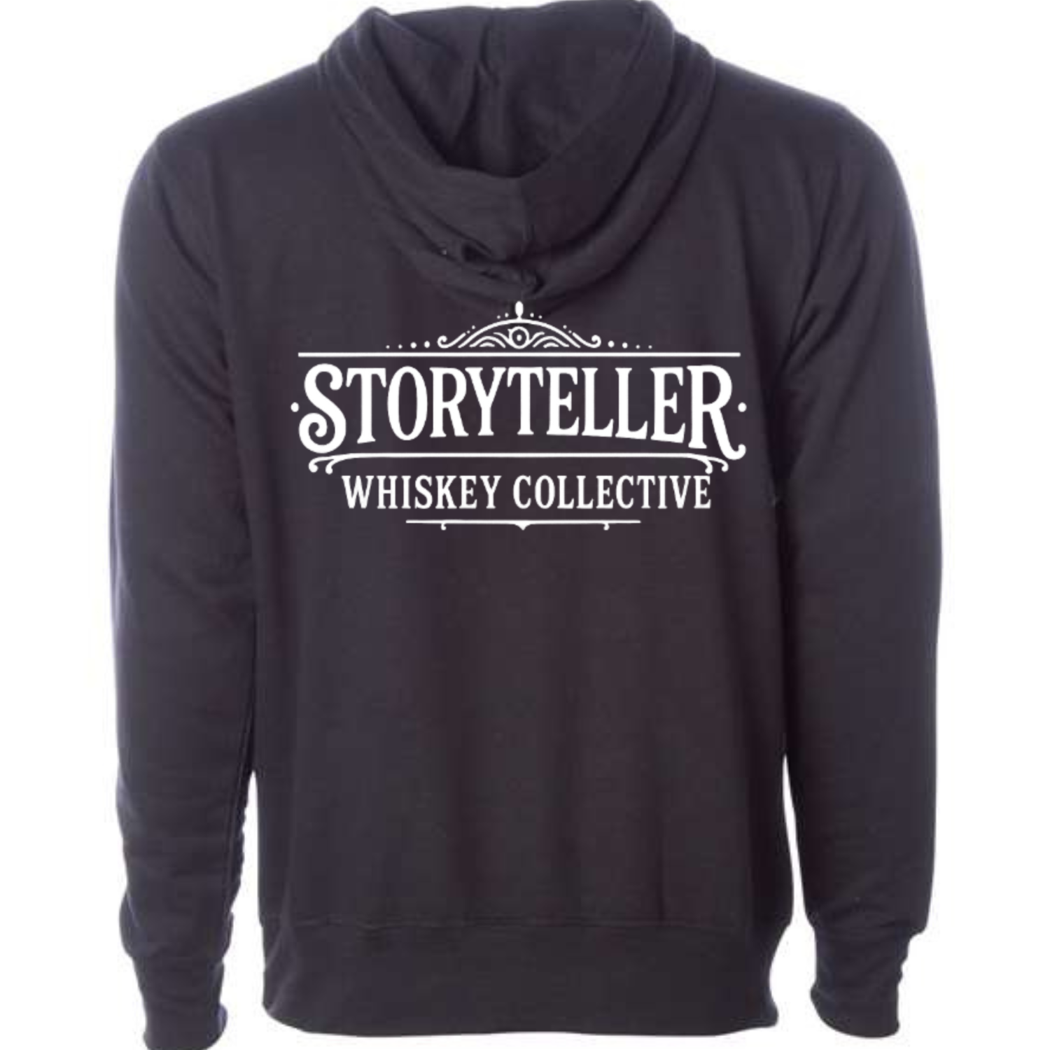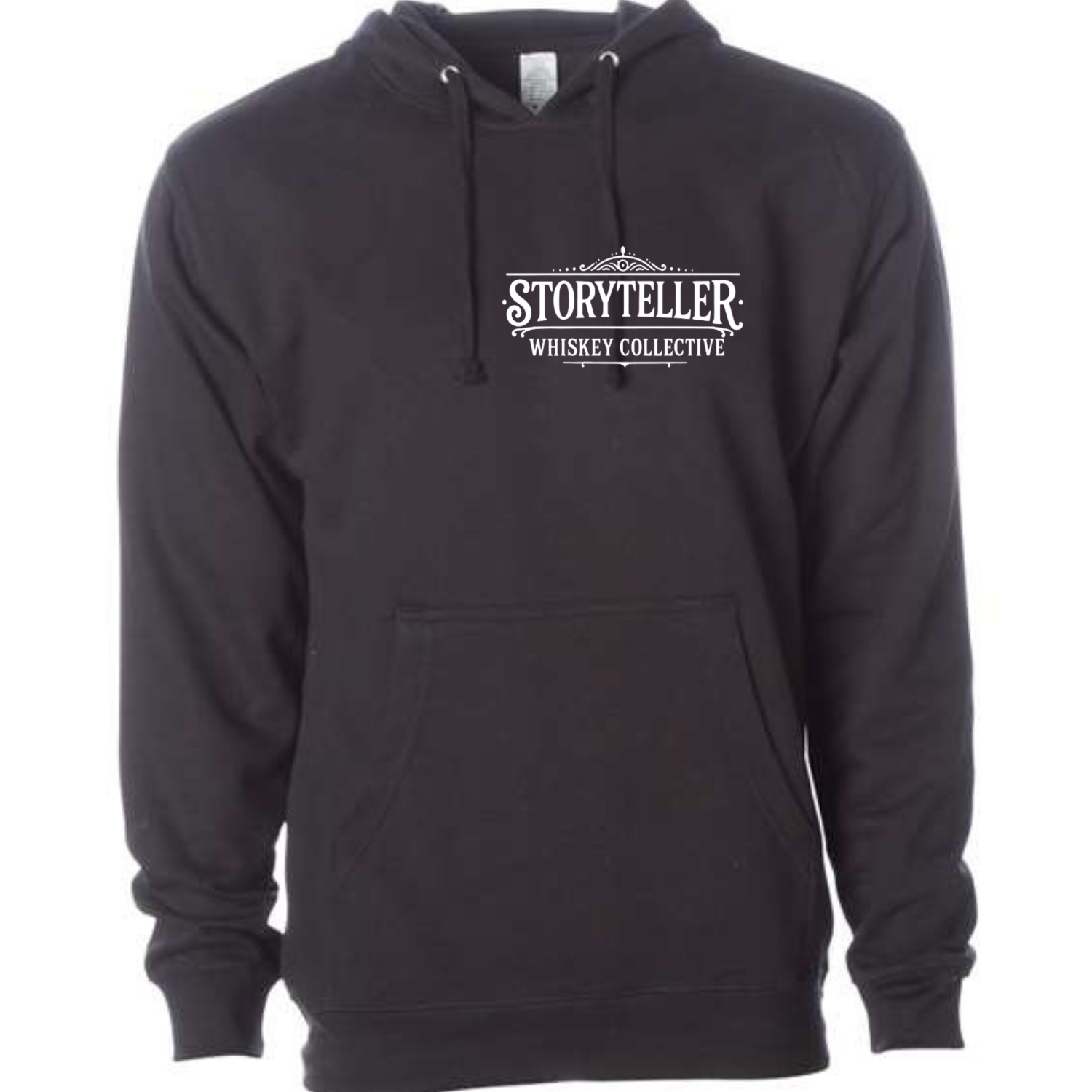 Black Gildan SoftStyle Hoodie with the Storyteller Whiskey Collective text logo printed on the left front chest and back.