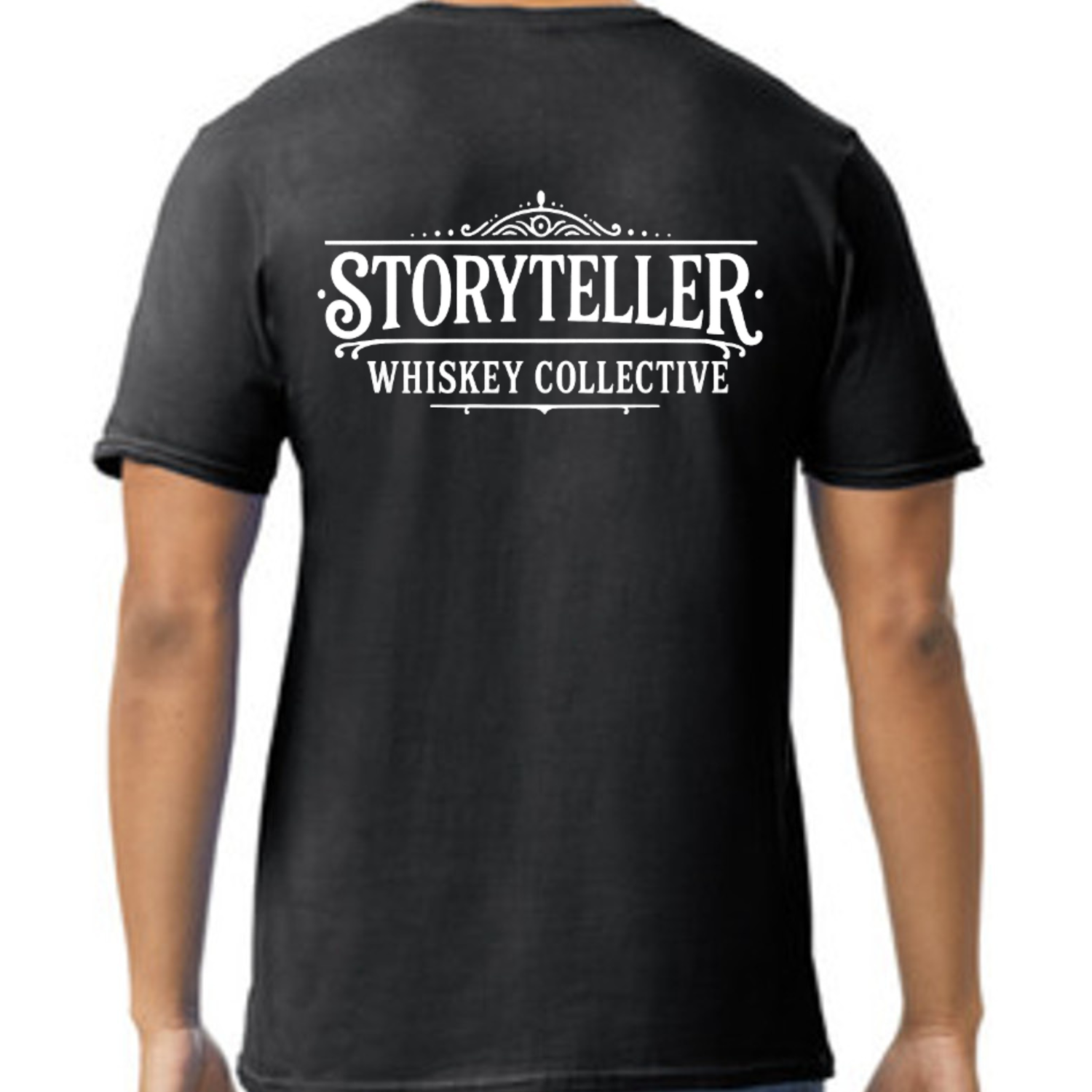 Black Gildan SoftStyle T-Shirt with the Storyteller Whiskey Collective text logo printed in white on the left front chest and on the back.